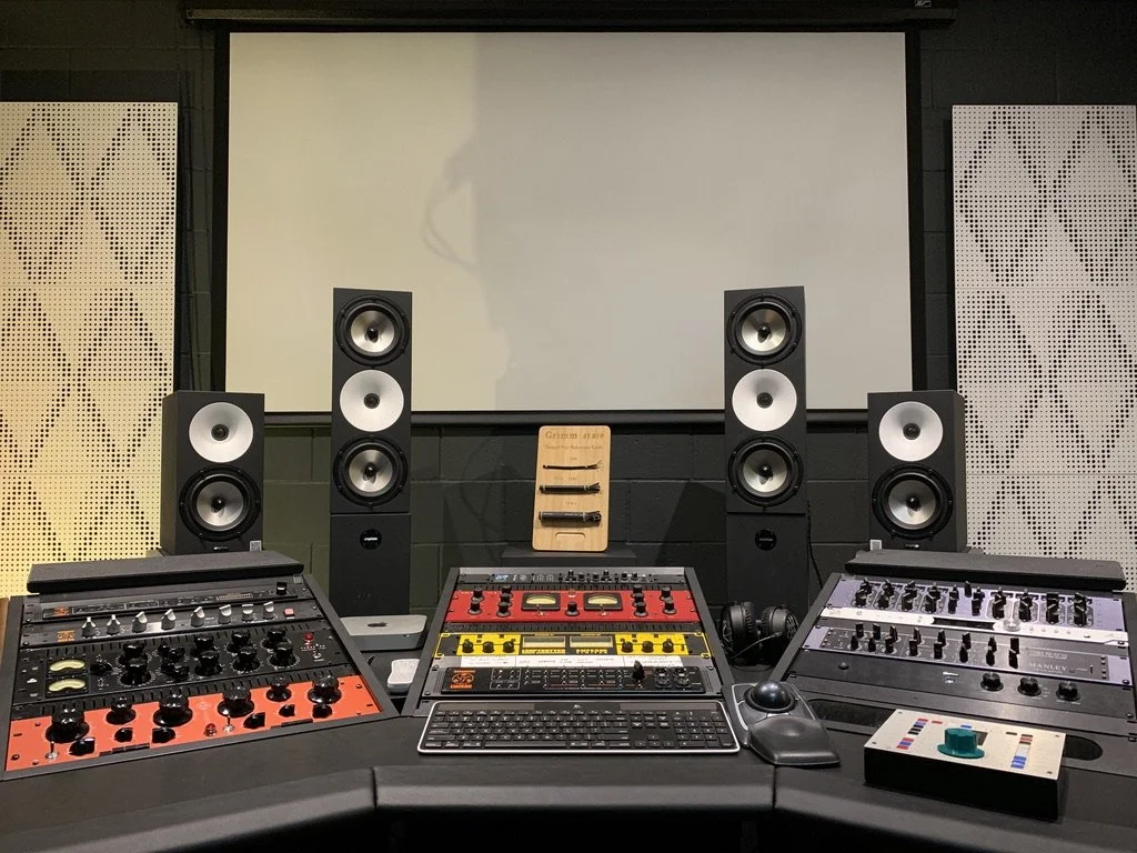 Lobby Mastering space at Pro Audio LA. This is dear to my heart as I was once captain of this ship. The desk is a Sterling Modular Plan C that is graced with some excellent mastering gear from D W Fearn, Looptrotter, Metric Halo, Dangerous Music, RJR and Manley. The Dangerous Liaison in the center is the insert switcher that allows all the outboard gear to be inserted into or out of the chain. The monitor controller is a Crane Song Avocet. The main monitors are Amphion Two18, coupled to the BaseTwo25 bass extension towers. The secondary pair is the One18, which is helped in the low end by the FlexBase25 in the center (hidden from view).
